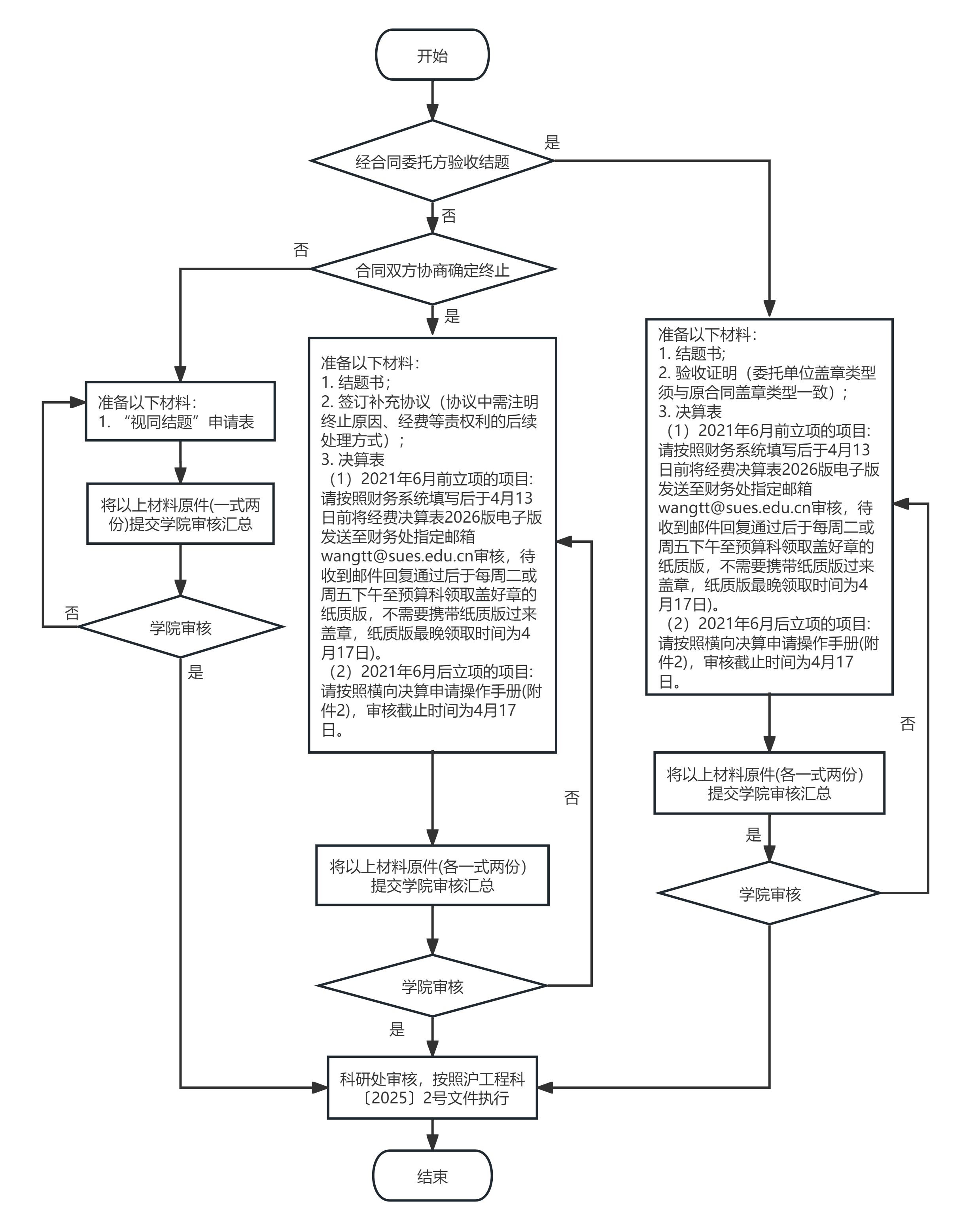 各相关项目负责人应在受理期间提交项目结题、项目终止或“视同结题”申请,相关结题材料请提交科研秘书,学院审核汇总后于2026年4月21日16:00前提交科研处。逾期未办理的结余经费将予以冻结。具体流程详见业务流程图(附件1)。